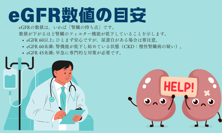 - eGFR 60未満: 腎機能が低下し始めている状態(CKD:慢性腎臓病の疑い)。