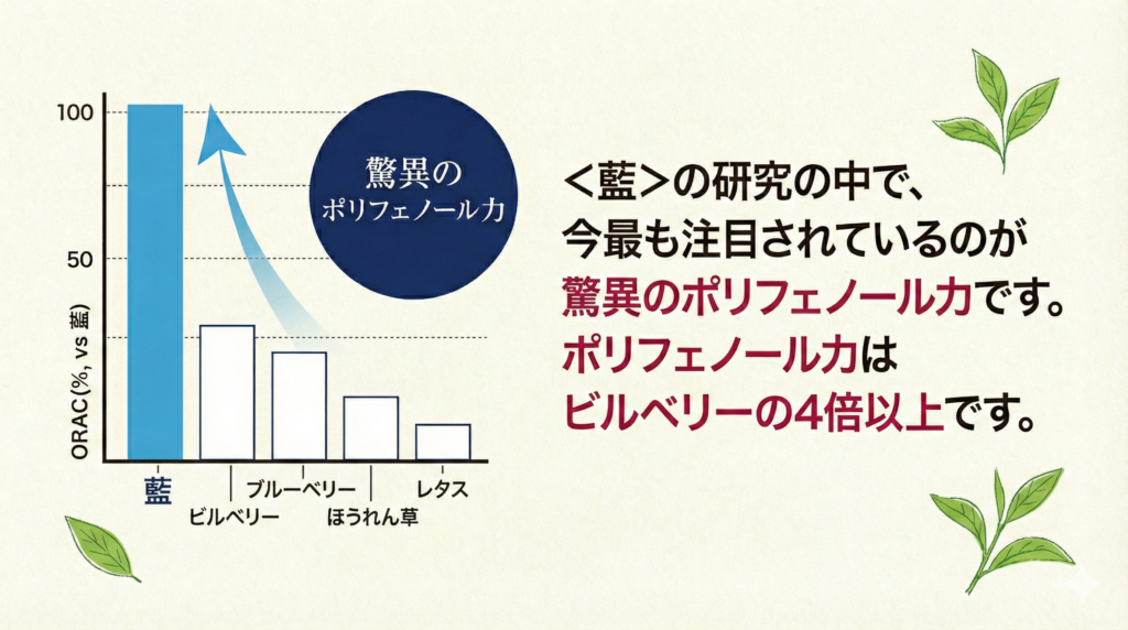 藍の研究の中で今最も注目されているのが驚異のポリフェノール力で、そのポリフェノール力はビルベリーの4倍以上です。
